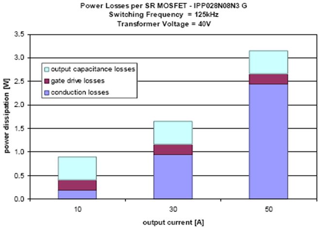 要優(yōu)化SR MOSFET的效率,必須找到開關(guān)損耗與導(dǎo)通損耗之間的最佳平衡點。在輕負載條件下,RDS(on)導(dǎo)通損耗占總功耗的比例極低。在這種情況下,在整個負載范圍內(nèi)基本保持不變的開關(guān)損耗是主要損耗。但是,當輸出電流較高時,導(dǎo)通損耗則成為最主要的損耗,其占總功耗的比例也最高,請參見圖2。