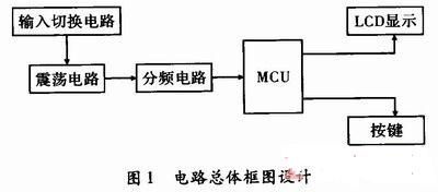 如圖1所示??驁D包括輸入切換部分、振蕩部分、分頻部分、單片機(jī)部分、顯示部分和鍵盤部分。此系統(tǒng)由STC89C51單片機(jī)作為控制核心,輸入切換部分采用雙刀雙擲繼電器完成待測(cè)電容或電感的線路切換,振蕩電路工作在放大諧振狀態(tài),頻率有高頻管9018的集電極輸出,由于頻率較高,所以需經(jīng)過信號(hào)分頻,再者由于輸出的電壓幅度大,此處無(wú)需再加一級(jí)驅(qū)動(dòng),以74LS393數(shù)字分頻芯片,把分頻端級(jí)聯(lián)實(shí)現(xiàn)100分頻,最終信號(hào)進(jìn)入單片機(jī),由單片機(jī)計(jì)算出頻率,經(jīng)過算法設(shè)計(jì),實(shí)現(xiàn)未知電容或電感參數(shù)的測(cè)定。圖1給出了系統(tǒng)的總體框架圖。