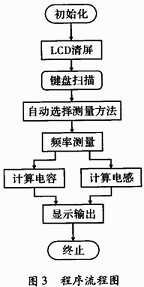 系統(tǒng)上電初始化并且清屏,單片機(jī)初始化完成后,進(jìn)入鍵盤掃描程序,當(dāng)要進(jìn)行電容或電感測(cè)量時(shí),選擇測(cè)量按鍵,系統(tǒng)進(jìn)行自動(dòng)判斷并進(jìn)行電容或電感的測(cè)量。當(dāng)判斷為電容時(shí),系統(tǒng)選擇電容的計(jì)算方法。當(dāng)判斷為電感時(shí),系統(tǒng)選擇電感的計(jì)算方法。計(jì)算完成后在液晶屏上顯示測(cè)量結(jié)果。下面是具體的程序流程圖,如圖3所示。
