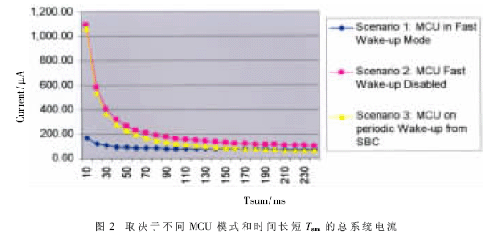 為了證明采用這種方法能夠節(jié)約電源,對(duì)現(xiàn)實(shí)生活中的實(shí)例進(jìn)行了評(píng)估。圖2顯示了普通系統(tǒng)基礎(chǔ)芯片(SBC)系統(tǒng)電流和S12X 車(chē)門(mén)系統(tǒng)電流在不同喚醒方法和圖1中顯示的時(shí)間參數(shù):
