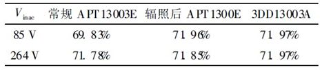表3是AP3765序列充電器中采用經(jīng)過10 kGy電子輻照的APT13003E 及3DD13003A 在85 V 和230 V 輸入電壓下輸出負(fù)載電流分別是0. 15 A、0.30 A、0. 45 A、0. 60 A 系統(tǒng)平均效率的結(jié)果。從表3中可以看出, 10 kGy電子輻照后的APT13003E的效率與3DD13003A 的效率基本相同。