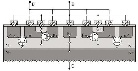 采用鉗位型開關(guān)晶體管也能降低開關(guān)晶體管的關(guān)斷延時, 其原理是通過鉗位電路使VBC在晶體管導(dǎo)通時不能增加到深飽和所需的0. 7 V, 這樣注入集電結(jié)兩側(cè)的少子很少, 使超量儲存電荷很少, 這樣儲存時間大大縮短。采用鉗位型開關(guān)晶體管主要有兩種, 一種是在集電結(jié)并聯(lián)肖特基二極管的晶體管,由于在高溫下漏電電流較大, 其ts - Vcesat的Trade??o ff關(guān)系最差, 目前應(yīng)用較少。另一種是橫向PNP鉗位型晶體管, 其結(jié)構(gòu)圖如圖6所示, 它在高溫下漏電較小, 能得到較好的Trade-off關(guān)系,電流放大系數(shù)基本不變, 目前得到了越來越多的應(yīng)用, 如吉林華微電子股份有限公司研發(fā)的產(chǎn)品3DD13003A 就采用了這種結(jié)構(gòu)。