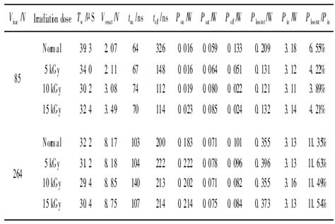 從表2中可以看出, 在85 V 交流輸入電壓下,輻照之后的APT13003E 比未輻照的APT13003E 的關(guān)斷延時有了大幅的減小, 因此關(guān)斷損耗大幅的減小, 如輻照為10 kGy的管子的關(guān)斷損耗減小為未輻照管子的1 /6; 導(dǎo)通延時有所增加, 但增加的幅度較小, 導(dǎo)通損耗有較小的增加; 飽和壓降隨輻照劑量的增加而增加, 因此通態(tài)損耗隨輻照劑量的增加而增加。開通損耗、通態(tài)損耗的增加與關(guān)斷損耗的減小是一對矛盾, 因此必須選擇合適的輻照劑量, 才能使開關(guān)晶體管總的損耗最小。