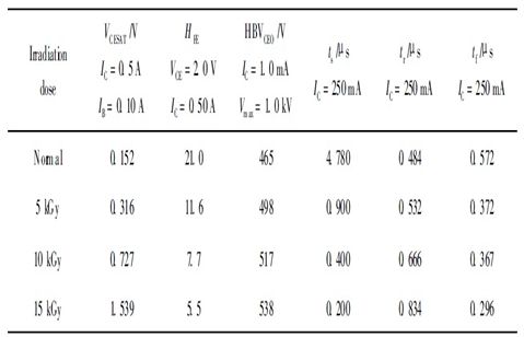 從表1中我們可以看到, 經(jīng)過輻照后, 儲存時間ts 隨著輻照劑量的增大有很大幅度的減小, 下降時間tf 有所減小, 上升時間tr 有所增加; 電流放大系數(shù)隨著輻照劑量的增加而下降; 飽和壓降和擊穿電壓HBVceo隨輻照劑量的增大而增大。