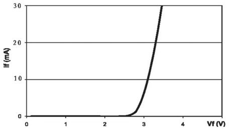 LED的伏安特性和普通的二極管相似。用于白光照明的藍(lán)光LED典型的伏安特性如圖1所示。