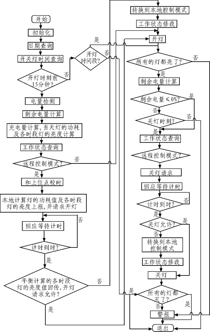 進行太陽能路燈電池板電流檢測,蓄電池電壓檢測,蓄電池電量監(jiān)測,以及環(huán)境溫度的檢測,采用光開時關(guān),并實時上傳工作環(huán)境及狀態(tài)數(shù)據(jù),預(yù)警故障,保證系統(tǒng)的可靠性。圖2為太陽能路燈的開、關(guān)控制流程網(wǎng)。
