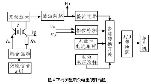 給電池施加一個固定頻率和固定電流(日前一般使用l kHz頻率、50 mA小電沆),然后對其電壓進行采樣,經(jīng)過整流、濾波等一系列處理后通過運放電路計算出該電池的內(nèi)阻值。圖4為在線測量剩余電量硬件框圖。