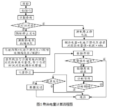 通過計算電流在時域上的積分,可得出電量變化值,在路燈工作前檢測到的電池電量作為初始電量,則剩余電量為初始電量減去電量變化值。同時通過對MPPT電路的輸出電流做積分,作為電量變化的校正值,從而得到較準確的剩余電量值。圖5為剩余電量計算流程圖。