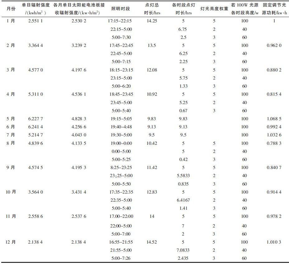 開關(guān)燈的時間根據(jù)天安門升降旗時間而定,如表1所示,全年最長點燈時長茌12月為14.52小時,最短為9.13小時。照明時間分為3個時段,第一個時段從當(dāng)天天安門降旗時刻開始,為5個小時,第二個時段到早上5點,第三個時段從5點到滅安門升旗時刻,燈光亮度各時段權(quán)重比為5:2:3,如果以100 W光源為設(shè)計標(biāo)準,則光源功耗最大為1.068 5 kW-h。