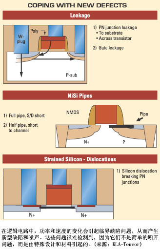 涉足尖端技術(shù)研究工作的芯片制造商正在把無數(shù)新材料和奇特的器件結(jié)構(gòu)結(jié)合起來,用于65nm及更低節(jié)點的量產(chǎn)。同時他們發(fā)現(xiàn),在這些研究上的努力生產(chǎn)的結(jié)果還包括目前必須著手解決各器件各個層上出現(xiàn)的越來越多的細(xì)微的電缺陷和微小物理缺陷。在存儲器中,可能會出現(xiàn)多晶硅阻塞管道問題poly-plug piping problems,從而引起B(yǎng)PSG(硼磷硅酸鹽玻璃)孔隙問題。在邏輯領(lǐng)域,使用應(yīng)變硅引起的應(yīng)變硅位錯可能產(chǎn)生缺陷,有時這類缺陷直到后道工藝才顯露出來。
