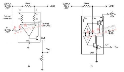 老式分路檢測電路基于差動放大器,即周圍帶四個電阻來設(shè)置增益并提供差動輸入的運算放大器 (operation amplifier)。這些電阻使運算放大器能接受超過其電源軌的共模電壓。不過,這也會帶來下面一些負(fù)面問題:一是電路必須配置為衰減器,在隨后的運算放大器級中恢復(fù)增益,如圖 2A 中的 IC 結(jié)構(gòu)圖所示,運算放大器的增益會成倍增大第一個放大器的偏置和漂移量,從而降低整體性能。二是采用高共模電壓差動放大器要增加電阻網(wǎng)絡(luò),以使之在仍然只提供單位增益的同時能夠接受較高的共模電壓。高共模差動放大器帶來的影響在于:運算放大器的噪聲增益與共模衰減成正比,如圖 2B 所示的差動放大器結(jié)構(gòu)采用了 20:1 的內(nèi)部共模衰減,此舉使放大器的偏置、漂移和噪聲都比運算放大器本身擴(kuò)大了 20 倍。此外,較大的輸入電阻也會造成較高的噪聲。