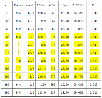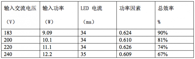 下面舉一個(gè)實(shí)測(cè)的結(jié)果為例,這是一個(gè)80顆3014串聯(lián)的球泡燈,采用了5顆Semitek 的S-562T并聯(lián)。它在不同的輸入市電電壓時(shí),所測(cè)得的結(jié)果如下表所示。