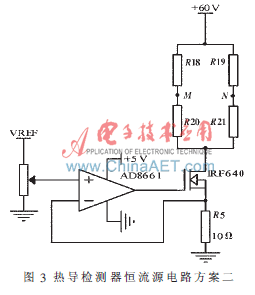 如果只是單純地將IRF640放在電橋的上方,而不加線性光耦HCNR201。如圖4所示,當(dāng)場效應(yīng)管IRF640截止,則M、N上的共模電壓為零,這樣雖然可以避免圖3方案的問題,但是當(dāng)橋流較大時(200 mA,橋電阻為100Ω),則場效應(yīng)管IRF640的柵極電壓達(dá)到20多伏,超過了AD8661的電源電壓范圍(±18 V)。因此圖3、圖4方案都不可行。