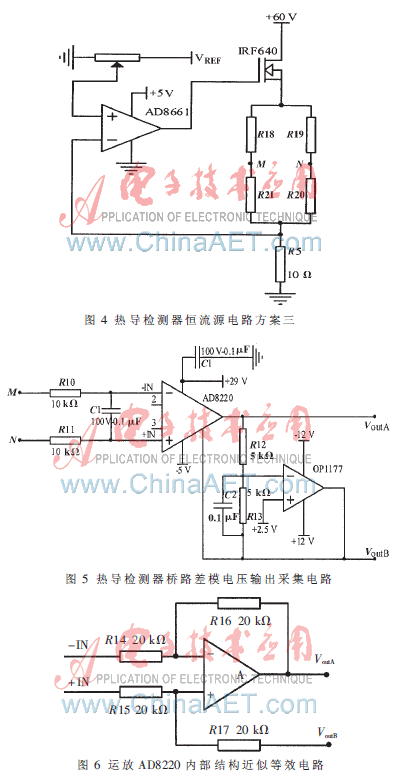 本文對三套恒流源進(jìn)行分析、比較、實驗,表明方案一的基線噪聲、溫度漂移小,優(yōu)于現(xiàn)有色譜儀熱導(dǎo)檢測器的指標(biāo),而且電橋檢測電路承受的共模電壓小,有利于保護(hù)檢測電路。
