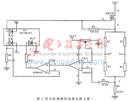 如圖2所示為恒流源的電路圖。輸出信號為M、N,即通過測量M、N兩點間的電位差,就能測出物質(zhì)的成分和含量。圖2中R5是采樣電阻,阻值10 Ω,當(dāng)電流為上限250 mA時,采樣電壓為2.5 V,采樣電壓輸入到AD8662的2腳,AD8662的3腳接電位器RW,RW的一端接地,另一端接+2.5 V電壓基準(zhǔn),此+2.5 V是通過穩(wěn)壓芯片ADR431輸出,溫度穩(wěn)定1 ppm/℃。設(shè)定好電位器的電壓后,當(dāng)AD8662的2腳、3腳電壓不相等時,其差壓經(jīng)運放AD8662開環(huán)放大(開環(huán)放大倍數(shù)2.2×105)驅(qū)動AD8662的5腳,U1B和線性光耦HCNR201構(gòu)成光耦隔離的放大電路,放大比為500 K/75 K=6.7倍。AD8662和HCNR201構(gòu)成放大比1.47×106的差壓放大電路,并且起到穩(wěn)流作用。當(dāng)橋流有0.1 μA的波動時,施加到IRF640柵極的電壓變化達(dá)1.47 V,使IRF640增加或減小電流,從而消除電流波動。