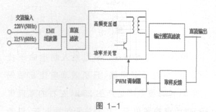 接入交流電網(wǎng)(50Hz ,220V AC 或者115VAC)經(jīng)EMI 防電磁干擾電源線濾波器,直接整流濾波變成直流,再經(jīng)變換器將直流電壓(275V 或172V)變換為數(shù)十KHz 或數(shù)百KHz的高頻方波或準(zhǔn)方波電壓控制功率開關(guān)管,經(jīng)高頻率變壓器隔離、降壓(或升壓),再經(jīng)高頻整流濾波后輸出直流電壓,經(jīng)取樣、比較、放大控制PWM 調(diào)制器驅(qū)動功率開關(guān)管的占空比。從而可以得到穩(wěn)定的輸出電壓。