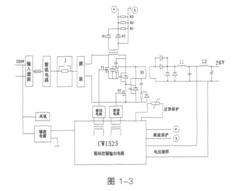 以上是開關(guān)電源基本原理和控制方式的介紹,結(jié)合我們實(shí)際工作中固態(tài)發(fā)射機(jī)開關(guān)電源控制方式以及理論理解,使我對大功率開關(guān)電源原理、整體控制方式有了進(jìn)一步的認(rèn)識?,F(xiàn)以5kW- 14CH 大功率合放式全固態(tài)電視發(fā)射機(jī)直流26V/100A 正激開關(guān)電源變換器的工作原理和維修方法來簡單介紹一下,如圖1- 3 所示: