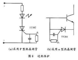 采用溫度繼電器來檢測(cè)電源裝置內(nèi)部的溫度,當(dāng)電源裝置內(nèi)部產(chǎn)生過熱時(shí),溫度繼電器就動(dòng)作,使整機(jī)告警電路處于告警狀態(tài),實(shí)現(xiàn)對(duì)電源的過熱保護(hù)。亦可將溫度繼電器置于開關(guān)三極管的附近,一般大功率管允許的最高管殼溫度是75℃,調(diào)節(jié)溫度整定值為60℃。當(dāng)管殼溫度超過允許值后繼電器就切斷電器,對(duì)開關(guān)管進(jìn)行保護(hù)。半導(dǎo)體熱敏開關(guān)器件“熱晶閘管”在超溫保護(hù)方面有重要作用。它可以用作溫度指示電路。根據(jù)p型控制柵熱晶閘管(TT102)的特性,由RT值確定該器件的導(dǎo)通溫度,RT越大,導(dǎo)通溫度越低。當(dāng)將其放置功率開關(guān)三極管附近,或在電源裝置內(nèi)時(shí),它就能起到溫度指示作用。當(dāng)功率管的管殼溫度或者裝置內(nèi)部的溫度超過允許值時(shí),熱晶閘管就導(dǎo)通,使發(fā)光二極管發(fā)亮告警。倘若配合光電耦合器,就可使整機(jī)告警電路動(dòng)作,保護(hù)開關(guān)穩(wěn)壓器。它亦可以象圖8(b)那樣用作功率晶體管的過熱保護(hù),晶體開關(guān)管的基極電流被n控制柵型熱晶閘管TT201旁路,開關(guān)管截止,切斷集電極電流,防止過熱。
