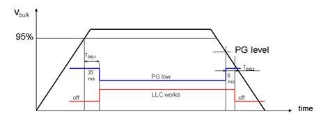 NCP1910的工作序列如圖3所示,如果PFC未就緒,LLC就不能啟動(dòng);一旦PFC就緒,就會(huì)開始一段20 ms的延遲;延遲結(jié)束后PGout引腳假定為低電平,LLC可以開始工作。在撥除交流輸入關(guān)閉電源時(shí)Vbulk降低,到達(dá)PG信號(hào)時(shí),PGout引腳被釋放(開路);如果Vbulk到達(dá)LLC停止電平,LLC停止工作;或者如果Vbulk緩慢下降,如處在輕載狀態(tài),LLC會(huì)在PGout引腳被釋放5 ms后停止工作。