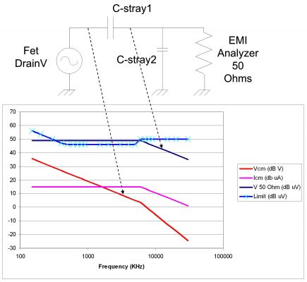 上升時(shí)間控制通過降低電源的開關(guān)速度來限制高頻譜,最適合解決 10MHz 以上的 EMI 問題。減小開關(guān)節(jié)點(diǎn)的寄生電容很容易,只需最小化蝕刻面積或者使用屏蔽材料。該節(jié)點(diǎn)到整流電源線路的電容,不會(huì)形成共模電流,因此您可以將導(dǎo)線埋入多層型印制線路板 (PWB),從而減少大量不需要的電容。但是,您無法徹底消除它,因?yàn)?FET 漏極和電感仍然余留有電容。圖 2 給出了一幅曲線圖,引導(dǎo)您逐步計(jì)算 EMI 頻譜。第一步是計(jì)算電壓波形(紅色)的頻譜。通過計(jì)算漏電壓波形的傅里葉級(jí)數(shù),或者只需計(jì)算基本分量然后對(duì)包線取近似值(1除以調(diào)和數(shù)和基本分量),便可完成上述計(jì)算。在高頻完成進(jìn)一步的調(diào)節(jié)(1/ (pi *上升時(shí)間)),如7MHz以上頻率所示。下一步,用該電壓除以寄生電容的電抗。有趣的是,低頻輻射為扁平穩(wěn)定狀態(tài),直到頻率穿過由上升時(shí)間設(shè)定的極點(diǎn)為止。最后,CISPR B 類規(guī)定也被繪制成圖。僅 0.1 pF 的寄生電容和一個(gè)高壓輸入,輻射就已接近于規(guī)定值。