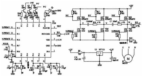 無位置傳感器控制系統(tǒng)以C8051F330單片機(jī)、逆變橋電路、端電壓檢測(cè)電路、穩(wěn)壓電路等組成。逆變橋電路中上橋臂為P型MOSFET器件FDS6679,下橋臂為N型MOSFET器件M4410B,均為低電壓驅(qū)動(dòng)器件。FDS6679通過一個(gè)NPN型三極管驅(qū)動(dòng),而M4410B由C8051F330的P1口直接驅(qū)動(dòng)(P1口設(shè)置成推挽輸出)。PWM控制模式定為:PWM僅應(yīng)用于半橋的下端MOSFET,同時(shí)換流的上端(對(duì)角線)MOSFET僅起換相通斷控制。