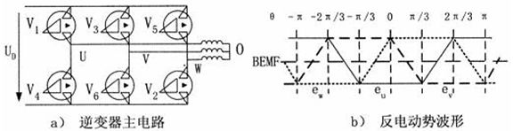 圖2 逆變器主電路和點(diǎn)擊的反電動(dòng)勢(shì)波形圖