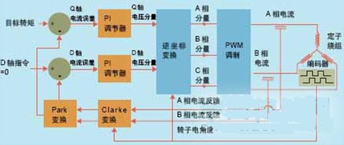 從控制原理上講,磁場(chǎng)定向控制方法的電流環(huán)運(yùn)行是獨(dú)立于電機(jī)旋轉(zhuǎn)的。在FOC方法中存在兩個(gè)實(shí)際的電流環(huán),一個(gè)用于Q軸轉(zhuǎn)矩,另一個(gè)用于D軸轉(zhuǎn)矩。Q軸轉(zhuǎn)矩電流環(huán)施以來自伺服控制器的用戶目標(biāo)轉(zhuǎn)矩,D軸電流環(huán)則施以零輸進(jìn)指令,以便使不想要的直軸分量降至最低。
