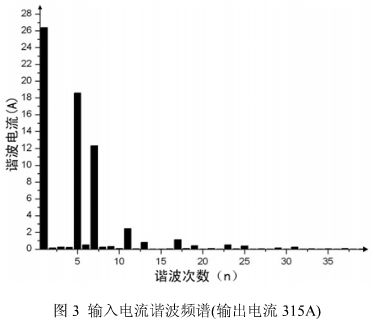 圖 3 是一臺無諧波抑制措施的 IGBT 逆變焊機(jī)輸出 315A電流時的輸入電流諧波頻譜, 諧波畸變率高達(dá)64%,大大超過了 GB15579.10-2008標(biāo)準(zhǔn)中表 B7諧波畸變率(THD)48%的限值,其 5 次、7 次諧波電流幅值過大是 THD 超標(biāo)的主要原因,11、13 次諧波電流符合標(biāo)準(zhǔn)限值要求。由此可見,低頻諧波幅值過大是 THD超標(biāo)的主要原因。同時,諧波畸變率高還會對 IGBT 逆變焊機(jī)的全功率因數(shù)產(chǎn)生不利影響。