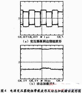 圖4(a)所示為實(shí)際全橋DC-DC電源變壓器原邊及副邊繞組帶載波形,其中CH1為原邊線圈兩端電壓,CH2為副邊線圈正電壓。由于器件分散性,實(shí)際測(cè)試DC-DC電源工作頻率為366 kHz,頻率偏差為3.8%,滿足設(shè)計(jì)要求。圖4(b)所示為動(dòng)態(tài)加載輸出波形,其中CH1為輸出正電壓,CH2為輸出負(fù)電壓。測(cè)試時(shí)負(fù)載為35 Ω/10 W,可以看到突加突卸額定負(fù)載時(shí)輸出正電壓較平穩(wěn),波動(dòng)<1 V,滿足設(shè)計(jì)要求;負(fù)電壓稍有波動(dòng),考慮到IGBT負(fù)壓是用來維持關(guān)斷狀態(tài),負(fù)壓在-5~-15 V即可,因此滿足半橋集成驅(qū)動(dòng)電源的要求。