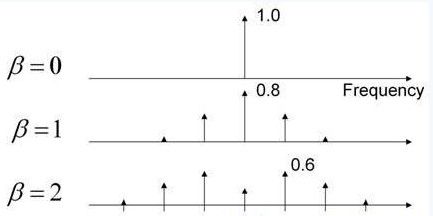 圖1顯示了通過正弦波改變調(diào)制指數(shù)產(chǎn)生的影響。當Β=0時,沒有出現(xiàn)頻移,只有一條譜線。當Β=1時,頻率特征開始延伸,且中心頻率分量下降了20%。當Β=2時,該特征將進一步延伸,且最大頻率分量為初始狀態(tài)的60%。頻率調(diào)制理論可以用于量化該頻譜中能量的大小。Carson法則表明大部分能量都將被包含在2*(Δf+fm)帶寬中。