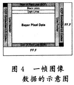 由APS陣列所獲得的圖像信息,經(jīng)過圖1中列模數(shù)轉(zhuǎn)換器(Column ADC)轉(zhuǎn)換為數(shù)字信號(hào)后,再經(jīng)過一系列的后續(xù)處理過程,得到輸出如圖4所示的幀圖像數(shù)據(jù)結(jié)構(gòu)。