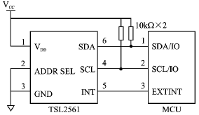 TSL2561可以通過I2C總線訪問,所以硬件接口電路非常簡(jiǎn)單。如果所選用的微控制器帶有I2C總線控制器,則將該總線的時(shí)鐘線和數(shù)據(jù)線直接與TSL2561的I2C總線的SCL和SDA分別相連;如果微控制器內(nèi)部沒有上拉電阻,則還需要再用2個(gè)上拉電阻接到總線上。如果微控制器不帶I2C總線控制器,則將TSL2561的I2C總線的SCL和SDA與普通I/O口連接即可;但編程時(shí)需要模擬I2C總線的時(shí)序來訪問TSL2561,INT引腳接微控制器的外部中斷。硬件連接如圖3所示。