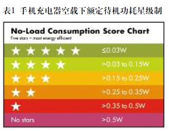這些關(guān)注的結(jié)果是采取一系列措施來提升效率和降低空載功耗的需求。其中最新最嚴(yán)格的是由全球前五大手機(jī)廠商提出的一項自愿性的充電器星級制協(xié)定,用以標(biāo)志在充電完成之后,充電器仍插在壁式插座上時的耗能量。該星級制從0星級開始,最高5星級??蛰d下額定待機(jī)功耗大于0.5W的充電器為0星級標(biāo)簽,待機(jī)功耗小于0.03W(30mW)的為5星級(見表1)。通過比較,大多數(shù)現(xiàn)有手機(jī)的待機(jī)功耗在150~300mW范圍。