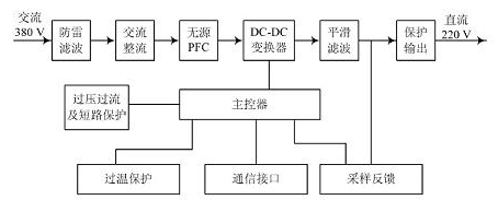 本文設(shè)計(jì)的整流模塊的工作原理框圖如圖2 所示,工作時(shí), 模塊首先通過(guò)過(guò)防雷處理和濾波對(duì)輸入的三相交流進(jìn)行處理,這樣才能保證模塊后級(jí)電路的安全; 經(jīng)過(guò)處理后的三相交流經(jīng)過(guò)整流和無(wú)源PFC 后轉(zhuǎn)換成高壓直流時(shí),這時(shí)轉(zhuǎn)換的高壓直流要經(jīng)過(guò)DC/DC變換器再次轉(zhuǎn)換成可變的直流電壓輸出; 另外模塊控制部分還有負(fù)責(zé)過(guò)壓、過(guò)流以及短路保護(hù)等作用,這樣才能保證輸出電壓的穩(wěn)定, 也同時(shí)能對(duì)模塊各部件進(jìn)行保護(hù)。模塊還在遠(yuǎn)程監(jiān)控中提供了 四遙 (遙控、遙調(diào)、遙測(cè)、遙信) 接口。[page]