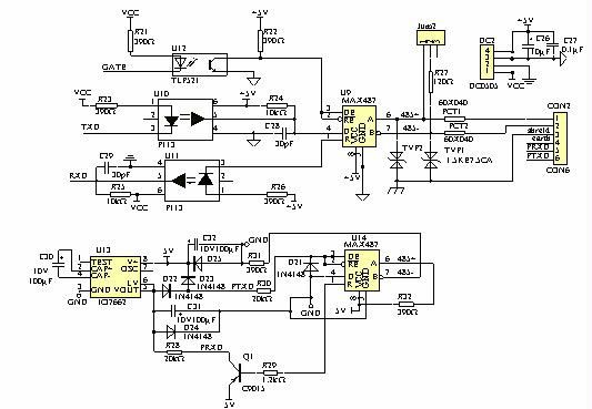 ②下半部分用于無源RS232→RS485的轉(zhuǎn)換電路,保證兩端同時(shí)可用,但在系統(tǒng)中只