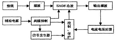 單相220V AC電壓一路經(jīng)整流橋整流濾波后作為SA08的功率電源;另一路經(jīng)AC/DC轉(zhuǎn)換、共模抑制后作為控制電路和SA08輔助電源;信號發(fā)生器產(chǎn)生頻率400Hz;幅度可調(diào)的正弦信號;信號發(fā)生器通過優(yōu)化電路設(shè)計和選用低溫漂元件實現(xiàn)輸出頻率的穩(wěn)定;控制電路對輸入指令信號進(jìn)行偏置、放大、PID及濾波處理、輸出限幅等;最后作為SA08輸入信號控制其功率輸出。過壓保護(hù)和過流保護(hù)也通過控制電路實現(xiàn);SA08輸出的高頻高壓SPWM波經(jīng)LC濾波器后供給負(fù)載;反饋電路直接從負(fù)載上進(jìn)行電壓電流取樣;確保控制的精度。