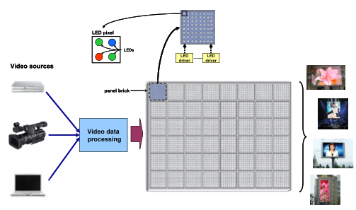 整個顯示屏通常由若干個正方形或矩形的點陣組成,每個點陣又由若干個像素組成。每個像素由RGB (紅、綠、藍)LED燈管組成,通過混合這些LED的燈光顏色,就可產(chǎn)生所需的像素信息。LED驅(qū)動器相當于被處理后的視頻數(shù)據(jù)與RGB LED發(fā)出的彩色燈光之間的接口(圖像就是由這些彩色光線構(gòu)成的)。