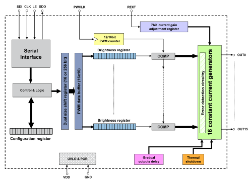這款產(chǎn)品是一個16通道LED驅(qū)動器,內(nèi)置一個高頻串行數(shù)據(jù)接口。每路通道的最大輸出電流為60mA,可以通過一個外部電阻器調(diào)節(jié)輸出電流,使用一個8位增益寄存器可以精確調(diào)節(jié)256級灰度。