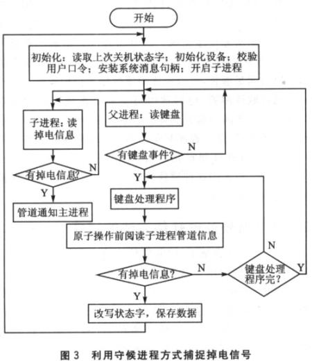 另一種方式是采用守候進程的方式,開通一個進程,此進程專門等待中斷信號。主程序根據數據操作對象的不同,將自己的流程方案劃分成若干原子操作,所謂原子操作即劃定的程序塊要么完全執(zhí)行,要么不執(zhí)行。每個操作對應惟一狀態(tài)標志。在每個原子操作前,主進程都將會通過管道通信的方式閱讀中斷信號。如果中斷信號產生,主進程首先保存狀態(tài)標志,然后將相關數據寫往Flash后退出,電源恢復后,主進程首先根據標志字確定系統(tǒng)恢復方案。圖3用流程圖的方式實現這一過程。