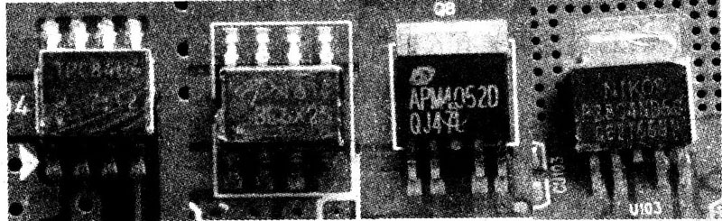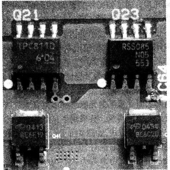 背光燈驅(qū)動(dòng)板主要由振蕩器、調(diào)制器、功率輸出電路及保護(hù)檢測(cè)電路組成,如1圖所示。在實(shí)際電路中,除功率輸出部分和檢測(cè)保護(hù)部分外,振蕩器、調(diào)制器及控制部分通常由一塊單片集成電路完成,這類(lèi)集成電路常用的主要有BD(Rohm公司生產(chǎn),如BD9884FV、BD9766等)及OZ系列(凹凸微電子公司生產(chǎn),如02960、02964等);功率輸出管多采用互補(bǔ)的功率型場(chǎng)效應(yīng)管,有的采用3腳和8腳(①~③腳為S極,④腳為G極,⑤-⑧腳為D極)貼片封裝型,常見(jiàn)型號(hào)有D454、RSS085、D413、TPC8110、FDD6635.FDD6637等,如圖2所示;還有的采用由N溝道和P溝道組合的5腳或8腳MOSFET功率塊(①腳為Sl極,②腳為Gl極,③腳為S2極,④腳為G2極,⑤~⑧腳為D1、D2極),如SP8M3、TPC8406、4614、APM40520、P2804ND5G等,如圖3所示。保護(hù)檢測(cè)多由集成電路10393、358、393或LM324及其外圍元件來(lái)完成。輸出電路主要由高壓變壓器、諧振電容及背光燈管組成,并設(shè)有輸出電壓、輸出電流取樣電路?!?/p>