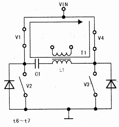 在t6~t7期間,V1、V4導(dǎo)通,V2、V3截止,L1與C1諧振,Ll中儲(chǔ)存的電能通過(guò)V1、V4給C1充電,流過(guò)L1的電流逐漸減小,其電流回路如圖20所示。