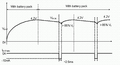 使用者亦有可能在充電或式充電完畢后,在未將電源移除的情況下,即抽離電池的情況。為避免造成危險(xiǎn),IC內(nèi)部應(yīng)具有如圖7, 8的電池存在偵測(cè)機(jī)制。充電IC會(huì)以短時(shí)間脈沖(每370ms產(chǎn)生2ms的脈沖)方式抽取電池電流,此時(shí)若電池存在,則偵測(cè)到的電池電壓應(yīng)大于一預(yù)設(shè)閥值;若電池已切離,則充電IC偵測(cè)到一低電壓,即可判定為電池?cái)嚅_(kāi)狀態(tài),并將電池端電壓切斷,保護(hù)使用者安全。