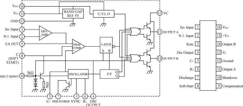 圖3 SG3525的內(nèi)部結(jié)構(gòu)圖和封裝圖