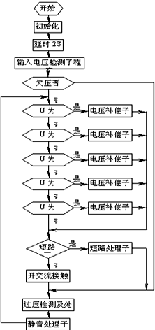 系統(tǒng)接通市電,合上電源開關后,單片機進行初始化,延時2秒后,進行輸入電壓檢測,若輸入電壓在允許范圍內,則根據電壓值進行相應的電壓補償,否則補償電路不進行任何動作,但要相應的聲光告警;電壓調整完畢達到輸出標準后,自動合上輸出交流接觸器,系統(tǒng)正常輸出。此時,單片機對輸出電壓進行過壓檢測,一旦輸出電壓過高,則切斷輸出,以防輸出電壓過高而影響負載工作,在電壓恢復正常后,自動合閘,輸出電壓。單片機還對輸入電壓進行實時檢測,只要市電發(fā)生變化,就進入相應的電壓補償子程序,對補償電壓進行調整。其流程圖見圖5。