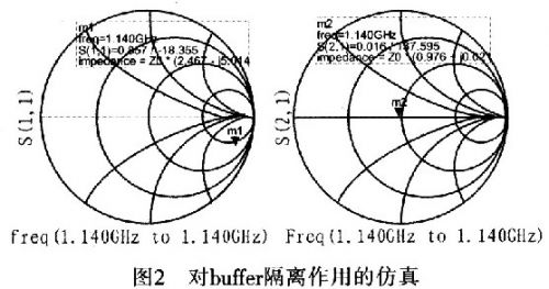 圖2是對buffer隔離作用的仿真。通過仿真發(fā)現(xiàn):壓控振蕩器與外部電路相接時,外部電路阻抗的變化不會對壓控振蕩器的阻抗產(chǎn)生影響。