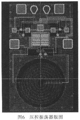 利用安捷倫公司的ADS軟件對電路進行仿真,從圖5可看出壓控振蕩器在控制電壓為1.98~3.98 V變化時,振蕩器調(diào)諧范圍為1.14~1.18GHz。圖6為壓控振蕩器電路版圖。