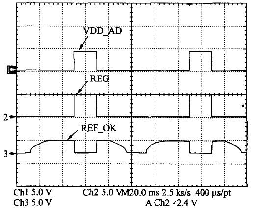 UVLO的啟動(dòng)電流測(cè)量值僅為17.8 A,實(shí)現(xiàn)了系統(tǒng)的低啟動(dòng)電流。系統(tǒng)上電和掉電的測(cè)試結(jié)果如圖11和圖12所示??梢?jiàn)系統(tǒng)在VDD的設(shè)置門(mén)限內(nèi)工作良好,REF-OK可以正確指示各個(gè)供電模塊正常工作。掉電過(guò)程正好相反。