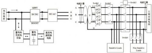 微網(wǎng)逆變器系統(tǒng)將可再生能源(如太陽能,風能,水能,地熱能,生物質(zhì)能等)轉變?yōu)榕c電網(wǎng)同頻、同相的交流電,優(yōu)先輸送給當?shù)刎摵晒╇?,剩余的電能饋入電網(wǎng)。微網(wǎng)逆變器系統(tǒng)主要包括:光伏組件、蓄電池組、蓄電池充放電設備、DC/DC變換器、微網(wǎng)逆變器、靜態(tài)開關等。