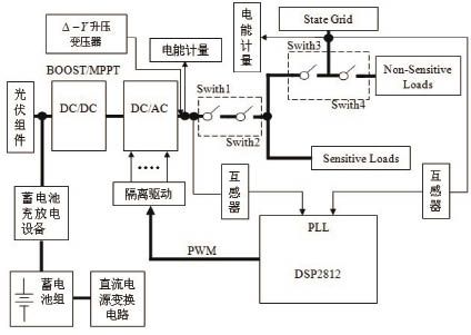 正常工作時,開關Switch1、Switch2、Switch3、Switch4同時閉合,為當?shù)刎摵商峁╇娔?;當出現(xiàn)電網(wǎng)缺相、電壓嚴重跌落等非正常狀況時,由DSP檢測出異常情況,做出判斷決策,并控制開關的開通與0關斷。這時,開通Switch1和Switch2,關斷Switch3,保證重要負荷的供電。當逆變器發(fā)生故障時,立即斷開Switch1,逆變器退出,同時斷開Switch4,由電網(wǎng)對重要負荷供電。當逆變器故障消失時,在與電網(wǎng)同步后,開通Switch1,再閉合Switch4,恢復對當?shù)刎摵傻墓╇姟.斝枰獧z修逆變器時,先斷開開關Switch2,檢修完成后,重新閉合Switch2。