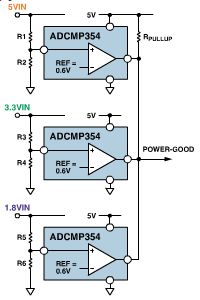 下圖1所示為利用ADCMP361監(jiān)控多路電壓軌的簡單方法,這是一款內(nèi)置基準(zhǔn)電壓的雙極性輸出、±0.275%精度的比較器 。由于ADCMP361內(nèi)置400mV高精度基準(zhǔn)電壓源,因此可以精確的監(jiān)控非常低的電壓,例如0.9V 的電壓軌。其中,每路電壓軌都使用獨(dú)立的電路。電阻分壓器將電壓軌按比例降低,并為每一路電源設(shè)置一個(gè)欠壓跳變點(diǎn)。所有的輸出被連接在一起,產(chǎn)生通用電源良好信號。